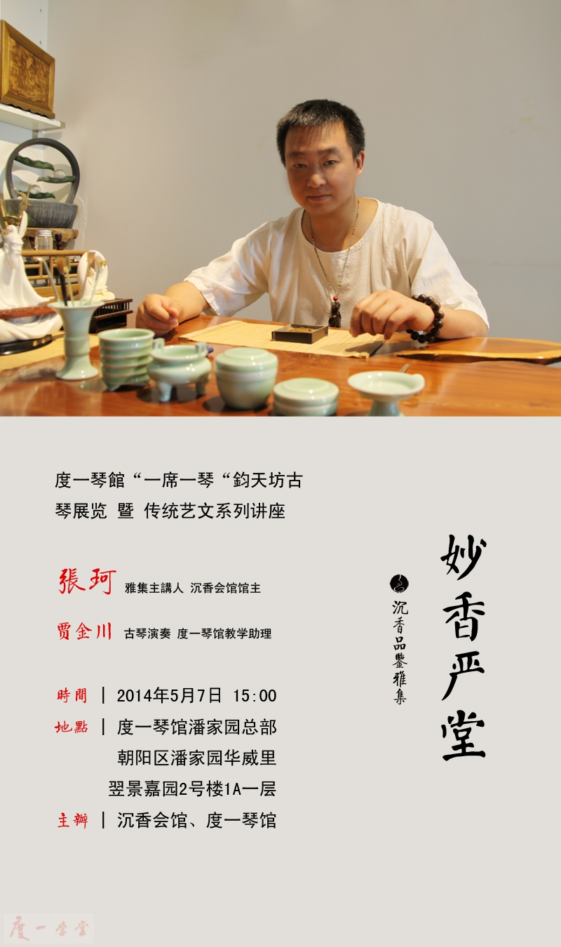 一席一琴 | 妙香严堂——沉香品鉴雅集 【活动预告】 時間: 2014/5/07 15:00 地點:度一琴館潘家園總部 (朝陽區華威里翌景嘉園2號樓1A一層) 報名方式:本次小型雅集 名额限30席 请致電琴館吴老师報名 報名電話: 13701021417 吴老师 沉香産於因自然力或人力而受損的沉香木,再经多年在自然界中沉埋熟化,最終形成。 因其殊為難得,且香品高雅,自古以来即被列为眾香之首 早在先秦時代,香料便被廣泛運用關於生活 至於香文化鼎盛的宋朝,用香更成為國人生活中不可或缺的部份。 香文化在中國可謂源遠流長 本次講座特請到妙香严堂堂主張珂先生,與大家分享沉香歷史文化 并于講座現場進行沉香品鑒。 同时,由度一琴馆教学助理贾金川老师带来古琴演奏。 |